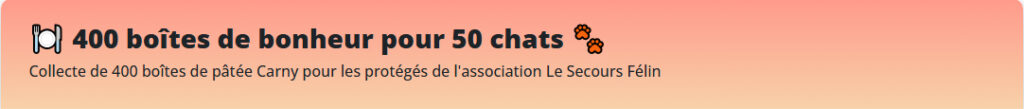 Lancement d’une collecte pour réunir 400 boîtes d’alimentation humide CARNY. Les formules humides sont souvent riches en protéines et en nutriments essentiels, ce qui est crucial pour la santé des chats âgés.